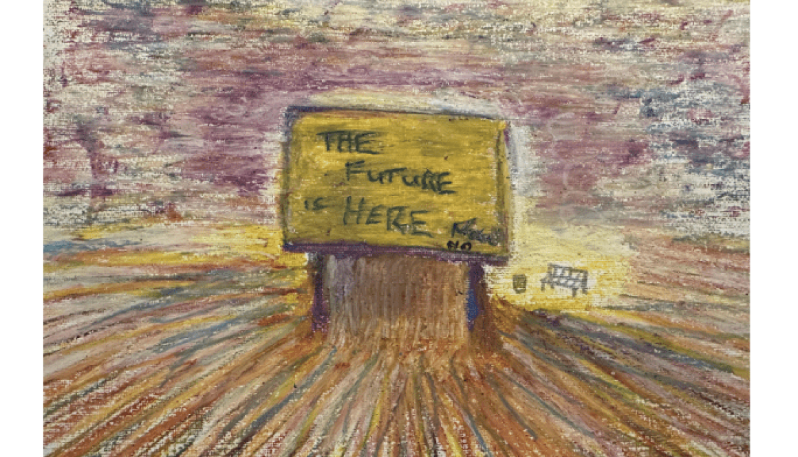 July 19th 1970. The sign says “The Future is Here’ and is already peeling off the hoarding. A strange sign to have by a roadside with nothing but a wooden bench and a wire bin. Not even a bus stop, or a lay-by to take a car from the tarmac and park in any safety. This future will have to be walked. The surroundings offer no brighter clue, a sullen clump of trees huddle in a field of sad grass and the blue sky and warm sun seem wasted on this empty scene. Except for a figure, walking across the grass and off the footpath, coming from what appears to be the coarse grasslands that lie behind the bench. They are heading toward the bench. They stop by the sign, the huge hoarding with the weathered paper of the crazy promise and just as we might think they’ll read the sign, come round the front, take a seat on the bench, ponder the future and what it might mean, the figure stops. It disappears for a few seconds, then it seems to be digging in amongst the weeds around the wooden frame that holds up the hoarding. It has something, a box, small, shining a metallic glint, it might be metal.